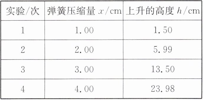 (4)由表中数据可知:当压缩量由1.00cm变为2.00cm时,压缩量变为2倍,而反映弹簧弹性势能大小的小球上升高度h从1.50cm变成了5.99cm,约是原来的4倍,所以弹簧的弹性势能$E_{\text{p}}$与压缩量x不成正比。进一步分析,$E_{\text{p}}$应该与压缩量x的平方成正比。