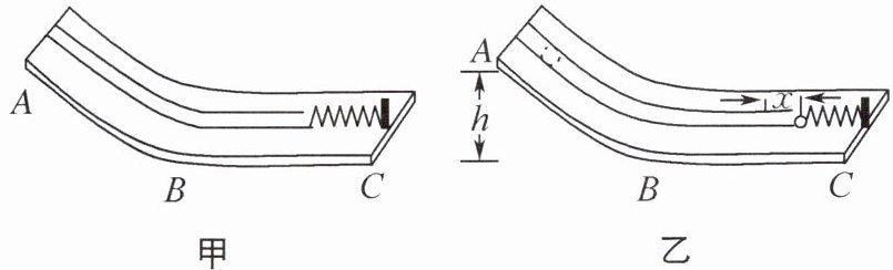 (3)课外兴趣小组活动中,物理老师曾经告诉同学们“重力势能的大小与物体被举起的高度成正比”。善于动脑的小明利用上述器材,设计了一个探究弹簧弹性势能Eₚ与压缩量x之间关系的实验方案,实验装置如图乙所示。用某个小球将弹簧压缩并测量出压缩量x。松手释放小球并在木板上记下小球上冲到达的最高位置,用刻度尺测量出小球上升的高度h。下表数据是小明的实验记录。由表可知,若压缩量x= 1.00cm,小球上升的高度为$h_1,$压缩量x= 2.50cm时,小球上升的高度为$h_2,$则$h_1______($填“>”“<”或$“=”)h_2。$
