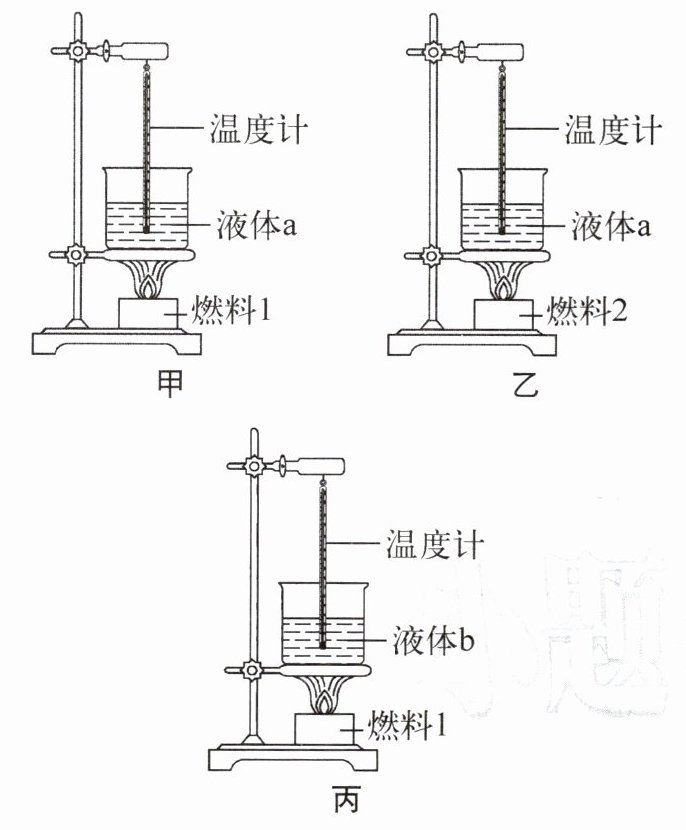 (3)燃料燃烧完前,甲中液体a已沸腾,燃料燃烧完时$T_{甲}>T_{乙}>T_{丙}$,液体b没有沸腾,$Q_{吸}$相等,$\Delta t_{a}>\Delta t_{b}$,故$c_{a}<c_{b}$。