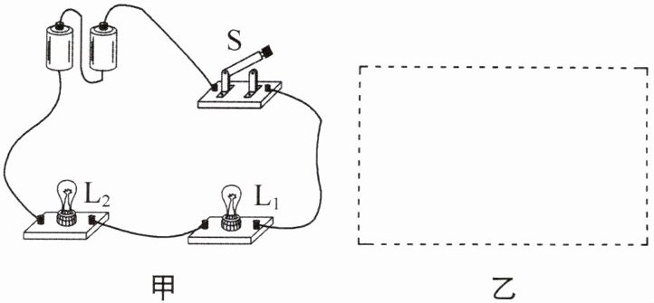 (1)连接完电路后闭合开关S,灯泡$L_1$和$L_2$均发光,此时电路中的电流方向从______(填“灯泡$L_1$到$L_2”$或“灯泡$L_2$到$L_1”),$在图乙虚线框中画出电路的电路图。