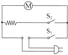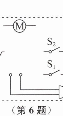 6. 如图所示,带有风叶的小电动机1只,电热丝1根,开关2只$(S_1、$$S_2),$插头1只,导线若干。请你利用这些器材连成一个有冷、热两挡风的电路。要求:只闭合开关$S_1$时吹冷风,只闭合开关$S_2$时既无风又不发热,同时闭合开关$S_1、$$S_2$时吹热风。请用笔画线作导线按要求将虚线框中的元件连接起来。