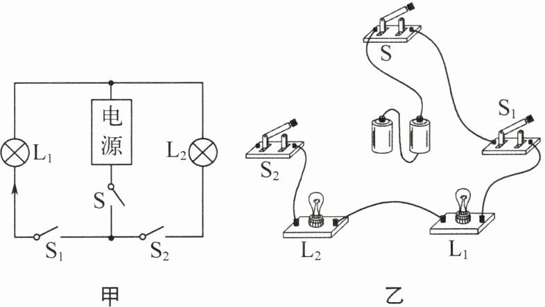 9. 小明同学利用灯泡$L_1、$$L_2$和三个开关S、$S_1、$$S_2,$一个电池组及导线若干组装电路,按要求设计的电路图如图甲所示。