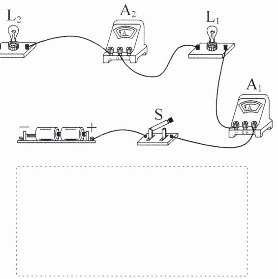 7. 请以笔画线代替导线,将电路连接完整并画出电路图。要求:两灯并联,电流表$A_1$测总电流,电流表$A_2$测通过$L_1$的电流,开关同时控制两个灯泡。