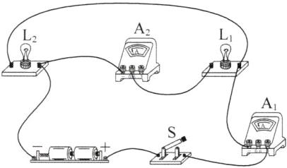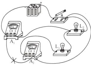 (1)闭合开关时,电流表在电路中相当于导线,即相当于导线直接接到了灯泡L₁的两端,则导致灯泡L₁短路,故灯泡L₁不发光,L₂发光。