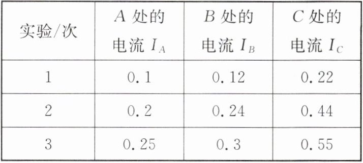 (4) 实验结束后,小明记录A、B、C各点的电流值如表所示: