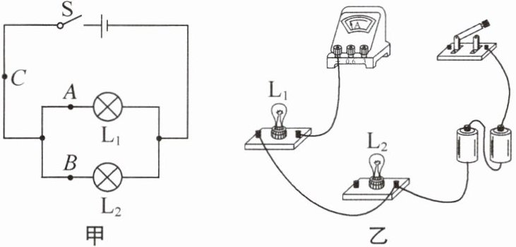 (3) 改进后,小明测出了C点的电流。接下来,小明准备测量A点的电流。请你在图乙中用笔画线代替导线,完成实物电路的连接。(灯$L_{1}$的电流约为0.3A)