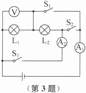 3. (2024·南通如东期中)如图所示,电源电压保持不变。灯$L_1、$$L_2$是两个不同规格的小灯泡。只闭合开关$S_1$时,电压表的示数为3V;只闭合开关$S_2$时,电压表的示数为1.2V;只闭合开关$S_1、$$S_3$时,两电流表的示数分别为0.46 A、0.18 A。下列说法正确的是 (