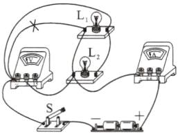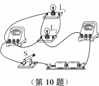 10. 小伟连接两灯并联电路的情况如图所示。当他“试触”时,发现电压表的指针不动、电流表的指针很快向右偏转,两灯都不发光。小敏指出他在电路连接中有错误,若闭合开关S,可能造成的后果是______。请你只改接图中的一根导线,使电路连接完全正确。(在错接的导线上画“×”,然后画出正确的接线位置)