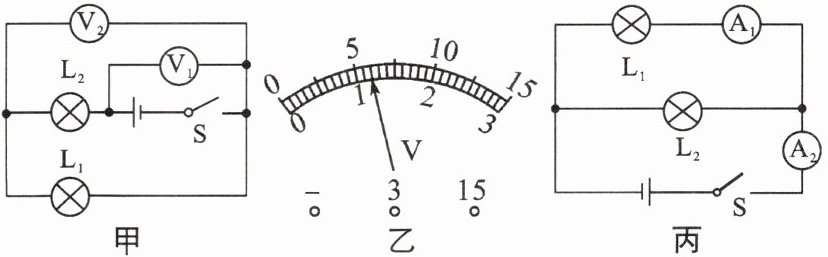 (2)若将灯$L_1$和$L_2$改接为图丙所示的电路,电源电压不变,闭合开关后灯$L_1$和$L_2$都发光,电流表$A_2$的示数为1.5 A,电流表$A_1$的示数为1.2 A,此时通过灯$L_2$的电流和$L_2$两端的电压是多少?