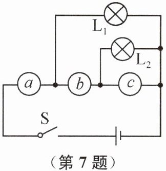 7. 如图所示,a、b、c是三个电表,且电路连接没有错误,两个灯泡均正常发光,已知a、b、c三个电表读得的数值依次为1.5、1.2、2.5(单位是A或V)。则电源电压为