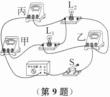 9. 小德同学在练习使用电压表、电流表时,连接了如图所示的实物电路图,由学生电源(电压恒定)、开关S、两个小灯泡和甲、乙、丙三个电表(可能是电流表或电压表)组成,电路中各元件均能正常工作。若乙电表为电流表,闭合开关S,甲电表一定不为