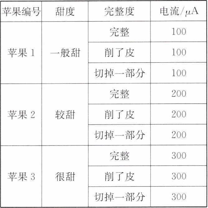 (3)通过苹果的电流与苹果的甜度有关 通过苹果的电流与苹果的形状无关