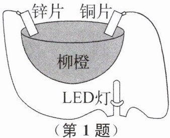 1. 如图所示,将一块铜片和一块锌片插在一个切开的柳橙上,就制作出了一个水果电池,将铜片、锌片和LED灯用导线连接,我们发现LED灯发光了,LED灯将电能转化为了