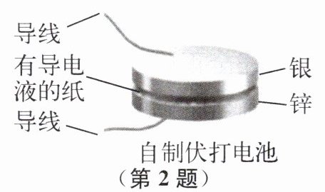 2. (2024·徐州泉山模拟)爱好科技的小华对最早的电池——伏打电池产生了浓厚的兴趣。通过上网查资料,他了解了伏打电池的结构后,决定亲自动手制作。如图是他制作出来的电池,银片和锌片分别是电池的两极。请你帮他设计实验判断该电池的正极是银片还是锌片。