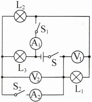 (1)开关S闭合时,三灯泡串联,V₂表测L₁和L₂两端的总电压,V₁表测灯L₁两端电压,因U₁+U₂=U_{V2}=7 V,U₁=U_{V1}=1 V,U₂=U_{V2}-U₁=7 V - 1 V=6 V。