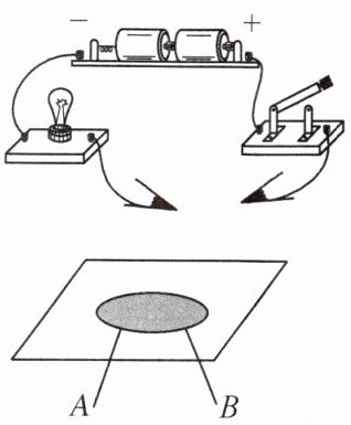 7. 为了探究电阻的大小与哪些因素有关,小明做了如下实验:他用自己的铅笔在白纸上涂抹出一片区域(图中阴影部分),将如图电路中导线的两个接头(图中的“鳄鱼夹”)分别接在图中A、B两点,闭合开关后,小灯泡亮了,说明铅笔芯是