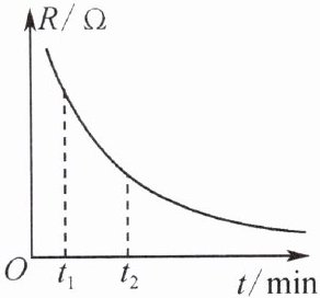 4. 一位同学研究导体的电阻与温度的关系时,通过使镍铬合金线降温,在不同时刻测量了一段镍铬合金线的电阻,其电阻一时间图像如图所示,与$t_{2}$时刻相比,$t_{1}$时刻的温度较高,电阻较