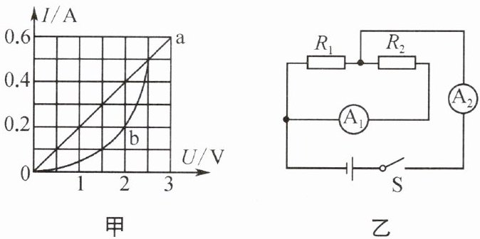 1:3 0.2 提示:由图乙知R₁和R₂并联,电流表A₁测量R₂的电流,A₂测干路电流;将元件a、b并联后接在电压为2V的电源两端时,$U_{a}=U_{b}=2V$,由图甲知$I_{a}=0.4A$,$I_{b}=0.2A$,电流表A₁的示数$I_{1}=I_{b}=0.2A$,A₂的示数$I_{2}=I_{a}+I_{b}=0.4A + 0.2A = 0.6A$,A₁与A₂读数之比为$\frac{I_{1}}{I_{2}}=\frac{0.2A}{0.6A}=\frac{1}{3}$;将元件a、b串联后接在电压为3V的电源两端时,由图甲知,当$I = I'_{a}=I'_{b}=0.2A$时,$U'_{a}=1V$、$U'_{b}=2V$,符合电源电压U = 3V,则流过元件b的电流是0.2A。