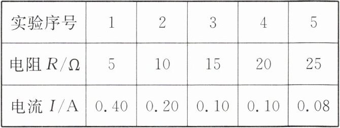 2 3 25 4 提示:探究电流与电阻的关系时,要控制电阻两端的电压不变,Uᵥ = IR = 0.4A×5Ω = 0.2A×10Ω = 0.1A×20Ω = 0.08A×25Ω = 2V≠0.10A×15Ω,故第3次实验的数据存在错误。$I_{3}=\frac{U_{V}}{R_{3}}=\frac{2V}{15\Omega}\approx 0.13A>0.10A$,Rₐₙ连入的阻值应比正常情况下大,故只有可能是第4、5次实验时未调节滑片P就读取电流;若第4次未调节滑片P就读取电流,U = RₐₙI₄ + U₄ = RₐₙI₃ + U₃,但$R_{变}×0.1A + 1.5V≠0.1A×R_{变} + 2V$,与电源电压相等矛盾;若第5次未调节滑片P就读取电流,同理有U = Rₐₙ×0.1A + 1.5V = 0.08A×Rₐₙ + 2V,得Rₐₙ = 25Ω,电源电压U = 4V。