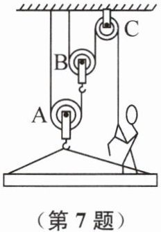 7. 如图所示是一套简易升降装置示意图,其上端固定在楼顶,工人用力拉绳子,装置可使人与工作台升至所需高度。装置中滑轮A、B、C的重力分别为100 N、50 N、40 N,人的重力为600 N,当人用100 N的拉力向下拉绳子时,地面对工作台的支持力为450 N,则工作台的重力为______N。(不计绳重和摩擦)