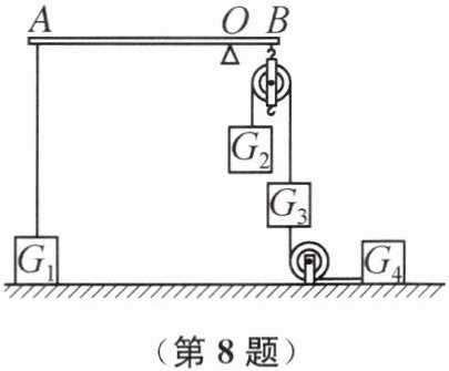 8. 如图所示装置中,AB为水平轻质杠杆,O为支点,$AO:OB= 4:1$,$G_{1}= 150\ \text{N}$,$G_{3}= 160\ \text{N}$。水平地面上的物体$G_{1}$通过细绳悬挂在A点,$G_{2}$、$G_{3}$、$G_{4}$通过滑轮连接,滑轮悬挂于B点,$G_{2}$恰好匀速下降,此时地面对物体$G_{1}$的支持力为50 N,则$G_{2}$受到的重力为______N。若用力F沿水平方向向右匀速拉动物体$G_{4}$,使$G_{2}$匀速上升,则力F的大小为______N。