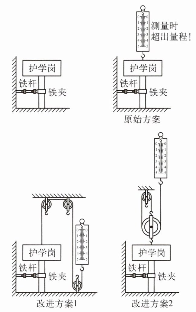同学们讨论后,认为猜想1、猜想2都合理,为确定哪一种猜想起主导作用,同学们先采用原始方案,测量时发现超出弹簧测力计的量程,于是设计出改进方案1、改进方案2,如图所示,每个滑轮重均为0.3 N,不计绳重及滑轮处摩擦。
