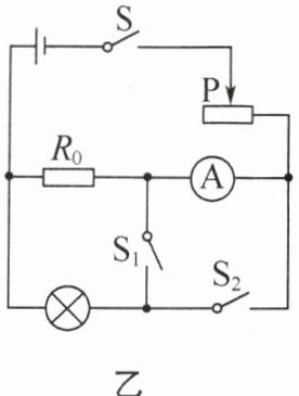 ②保持滑动变阻器滑片P的位置不变,断开开关$S_{2}$,闭合$S_{1}$,电流表示数为$I_{2}$,则小灯泡正常发光时的电阻$R= $______(用$R_{0}$、$I_{1}$、$I_{2}$表示)。