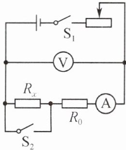提示:(3)断开开关S₂,移动滑动变阻器滑片,读出电压表的示数U₂和电流表的示数I₂。(4)开关S₁、S₂都闭合时,待测电阻短路,电压表测电流表和定值电阻的总电压,由欧姆定律可知,定值电阻和电流表的总电阻$R_{0A}=\frac{U_1}{I_1}$;断开开关S₂时,电压表测待测电阻和定值电阻及电流表串联的总电阻$R_{x0A}=\frac{U_2}{I_2}$,定值电阻及电流表的内阻不变,则待测电阻$R_x=\frac{U_2}{I_2}-\frac{U_1}{I_1}$。