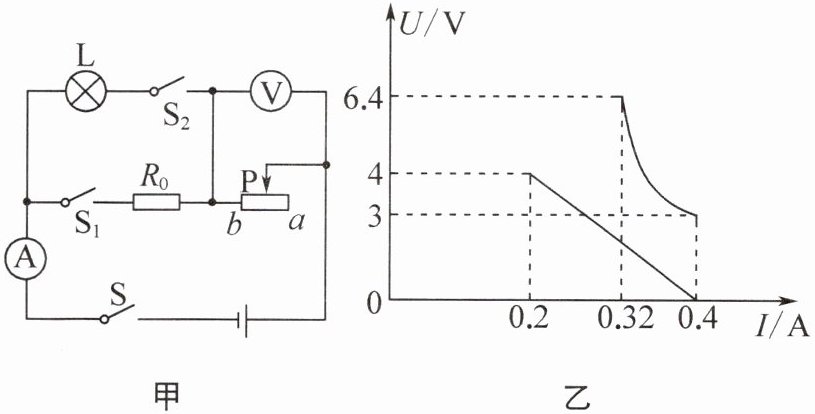 4. 如图甲所示,电源电压不变,电流表的量程0~0.6 A,电压表的量程为0~15 V,小灯泡的参数模糊不清,第一次只闭合开关S、$S_{1}$,保证电路的安全,将滑动变阻器的滑片P在最大范围内移动;第二次只闭合开关S、$S_{2}$,保证电路的安全,将滑动变阻器的滑片P在最大范围内移动。图乙是根据这两次实验绘制的电压表与电流表示数关系的图像。下列选项错误的是 (