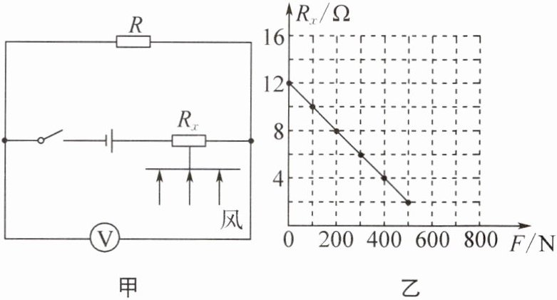 6. (2024·盐城东台期末)在中学生科技创新大赛中,某参赛小组设计了一种测定风力大小的装置,如图甲所示,迎风板与压敏电阻Rₓ连接,工作时迎风板总是正对风吹来的方向。压敏电阻的阻值随风力变化而变化,其阻值Rₓ与风力F的关系如图乙所示。电源电压恒为12V,定值电阻R为4Ω。