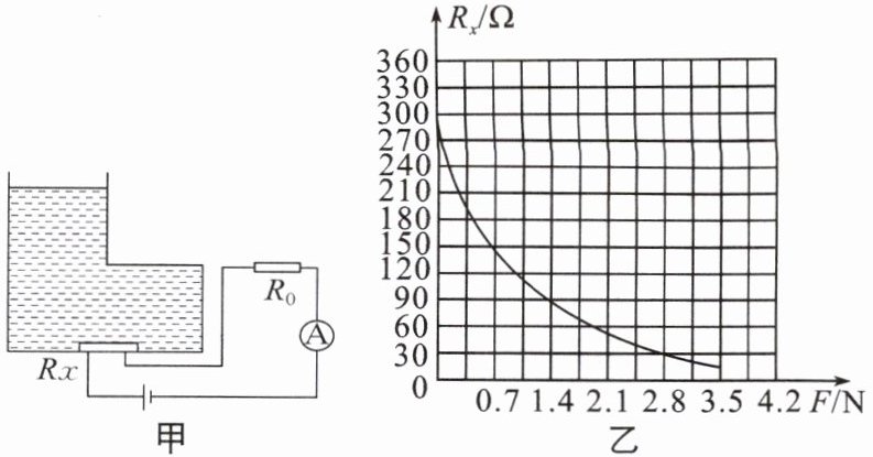 8. 如图甲所示为某型号汽车的自动测定油箱内油量的电路原理图,其中电源两端的电压恒为24V,R₀= 10Ω,A为油量指示表(一只量程为0~0.6A的电流表),Rₓ为压敏电阻,它的上表面面积为$10cm^2,$其阻值与所受压力的变化关系如图乙所示,当油箱加满油时,油量指示表的指针指在满刻度处。问:
