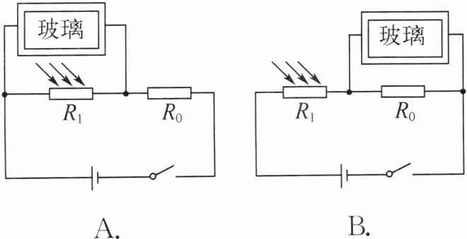 A 提示:图A和图B中,当光照增强时,R₁的阻值变小,电路中的电流变大,U₀变大,U₁变小,为保证光照增强,施加于玻璃两端的电压降低,故玻璃应并联在R₁两端;图C和图D中,光照变化时,玻璃两端的电压不变,等于电源电压。