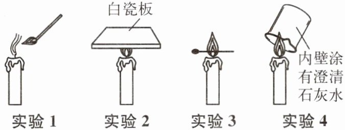 B 提示:"白烟"是石蜡蒸气遇冷变成的石蜡小颗粒,实验1中点燃"白烟",蜡烛可再次被引燃;实验2中白瓷板下面会出现黑色固体,是蜡烛不完全燃烧生成的炭黑;实验3中外焰部分的火柴梗最先炭化,是因为外焰温度最高;实验4中烧杯内壁的澄清石灰水变浑浊,是因为蜡烛燃烧生成了二氧化碳,二氧化碳能使澄清石灰水变浑浊。