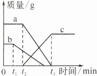 B 提示:由图可知,一开始a的质量多,b的质量少,且两者质量均随时间的增加而减少,所以a代表KClO₃,b代表KMnO₄。t₁min KMnO₄分解就有氧气产生,故c不代表氧气,a(KClO₃)分解后立即产生c,说明c代表KCl;t₁min KMnO₄开始分解产生氧气,同时生成二氧化锰;高锰酸钾分解产生的二氧化锰是氯酸钾分解的催化剂。