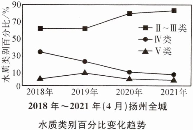 ①环保部门对水质进行长期监测,将水质从“优”到“劣”分为Ⅰ~Ⅴ类。由下图可知,近年来扬州市Ⅱ~Ⅲ类优良水质百分比明显呈____