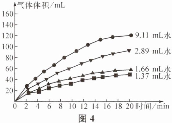 向锥形瓶中加入1.41g过碳酸钠、0.2g$MnO_{2}$和9.11mL水,再分别用不同体积的水进行实验。记录并处理20min内数据如图4所示。