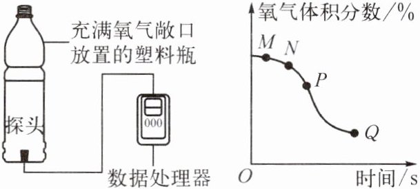 10. 某化学兴趣小组借助氧气传感器探究微粒的运动,数据处理软件可实时绘出氧气体积分数随时间变化曲线。收集一塑料瓶氧气进行以下三步实验:①敞口放置;②双手贴在塑料瓶的外壁上;③将塑料瓶的瓶口朝下,三步实验中测得氧气的体积分数随时间变化的曲线依次为图中的MN段、NP段和PQ段。