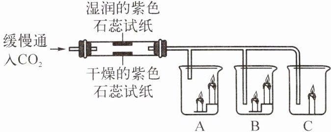 ,能得出“$CO_{2}$与水发生反应”的结论。②通入$CO_{2}$一段时间后,三个烧杯中蜡烛均熄灭,能证明“$CO_{2}$密度大于空气”的是烧杯