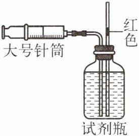 。(4) 探究溶解能力:如图所示,用大号针筒抽取 200 mL$CO_{2}$,试剂瓶中加入 200 mL水(恰好加满),塞紧双孔橡皮塞,连接大号针筒和试剂瓶,缓慢推动活塞,将$CO_{2}$注入水中。当向水中注入$CO_{2}$体积达到 120 mL时,红色油柱开始向上移动,实验表明在该条件下,1体积水中能溶解