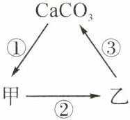 D 提示:石灰石的主要成分是碳酸钙,碳酸钙在高温的条件下分解为氧化钙和二氧化碳,甲中含有金属元素,因此甲是氧化钙;乙中也含有钙元素,由氧化钙可以生成乙以及乙可以生成碳酸钙可知,乙是氢氧化钙。由上述分析可知,甲的化学式为CaO。反应①属于分解反应;反应②是氧化钙与水反应生成氢氧化钙,属于化合反应;反应③是氢氧化钙与二氧化碳反应生成碳酸钙沉淀和水,不属于基本反应类型。“粉骨碎身浑不怕”的原理是反应②,即氧化钙与水反应生成氢氧化钙;甲是生石灰,与水反应会放出大量的热,而碳酸钙难溶于水,温度不变,即可用水鉴别碳酸钙和甲(氧化钙)。