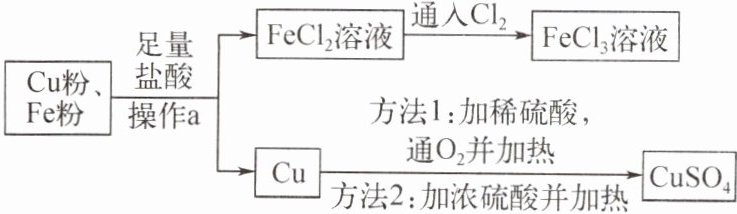 (1)过滤 (2)2FeCl₂+Cl₂=2FeCl₃ (3)在金属活动性顺序中,铜位于氢之后,与稀硫酸不反应 (4)方法1不会产生污染空气的二氧化硫气体,方法2会产生有毒的二氧化硫气体,污染空气