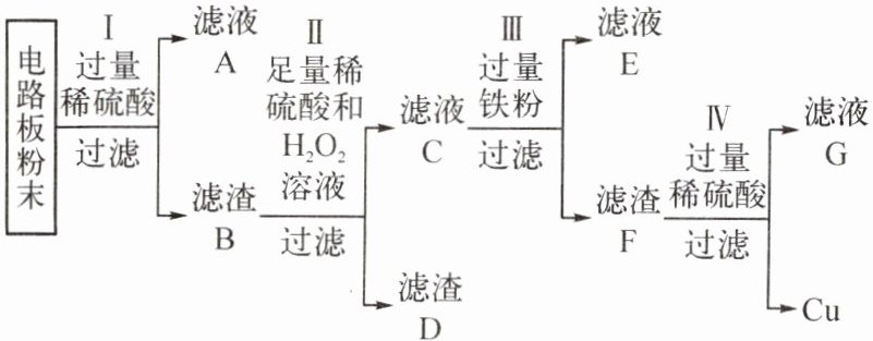 (5)①废旧手机的电路板中主要含有铜,还含有少量铝、铁、金等金属,加入过量稀硫酸,铝和稀硫酸反应生成硫酸铝和氢气,铁和稀硫酸反应生成硫酸亚铁和氢气,铜、金和稀硫酸不反应,稀硫酸过量,故滤液A中除Al₂(SO₄)₃外,还含有FeSO₄、H₂SO₄。②滤渣B中含铜、金,向滤渣B中加入足量稀硫酸和过氧化氢溶液,铜、过氧化氢和硫酸反应生成硫酸铜和水,故滤液C中含硫酸铜、硫酸和过氧化氢,向滤液C中加入过量铁粉,铁和硫酸铜反应生成硫酸亚铁和铜,铁和硫酸反应生成硫酸亚铁和氢气,铁过量,故滤渣F为Cu、Fe。