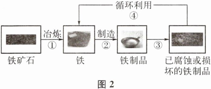 (4) 图2是铁制品循环利用的示意图,回收1t废钢铁可炼得0.9t钢,与冶炼矿石相比,可节约大约一半的成本,还可减少空气污染、水污染和固体废弃物的排放。请写出炼铁厂用一氧化碳作还原剂冶炼赤铁矿的化学方程式: