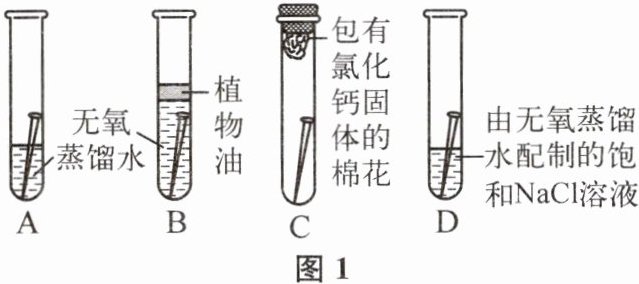 (3) 取四枚相同的洁净铁钉分别放入试管中,进行如图1所示实验,一段时间后发现A、D试管内铁钉锈蚀,且D试管内的铁钉有较厚铁锈。B、C试管内铁钉无明显变化。(注:氯化钙固体用于除去试管内的水蒸气)