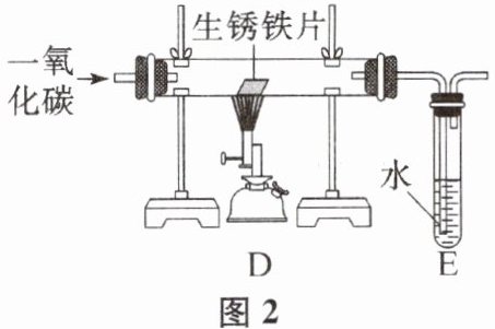 方案乙:称得生锈铁片的质量为$m_{2}g$,先按图2装置进行实验。当生锈铁片完全变成光亮的银白色时,停止加热,继续通入CO至室温。取出铁片,按图1装置继续进行实验。完全反应后,测得室温下产生氢气的体积为$V_{2}L$,查得其密度为$ρ_{2}g/L$。