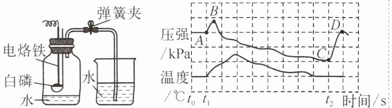 C 提示:要保证实验的准确性,白磷必须过量,将集气瓶内空气中的氧气全部消耗完;由图可知,实验过程中容器内温度先增大后减小至起始温度;曲线BC段温度先上升后下降,因此BC段白磷先燃烧一段时间后才停止;在t₂s时打开了弹簧夹,水进入集气瓶,气压增大。