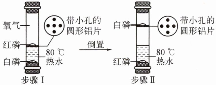 C 提示:带小孔的圆形铝片起载体作用,支撑红磷和白磷,将其与热水分离,同时还可以传递热量。步骤Ⅱ中白磷温度达到着火点且与氧气接触,能燃烧;红磷温度未达到着火点且未与氧气接触,不燃烧;步骤Ⅰ中白磷温度达到着火点但未与氧气接触,不燃烧;红磷与氧气接触,但温度未达到着火点,不燃烧;对比可知燃烧需要可燃物与氧气接触,且温度达到可燃物的着火点。该实验在密闭的容器内反应,对环境无污染,同时便于操作。
