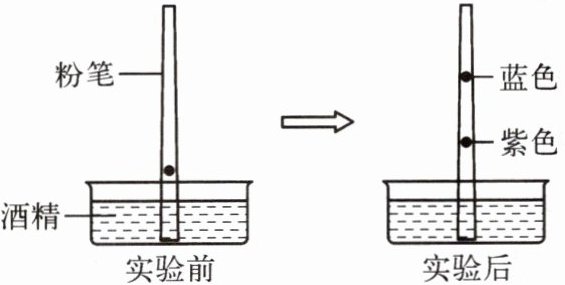 2. (绍兴诸暨期中)在靠近粉笔的粗端滴上一滴蓝墨水,然后将粉笔插入盛有酒精的容器中。一段时间后发现随着酒精沿粉笔上升,蓝墨水也在粉笔上不断移动,最后在粉笔上分为两个区域,上半部分是浅蓝色,下半部分是紫色,如图所示。根据上述现象判断,下列说法错误的是 (