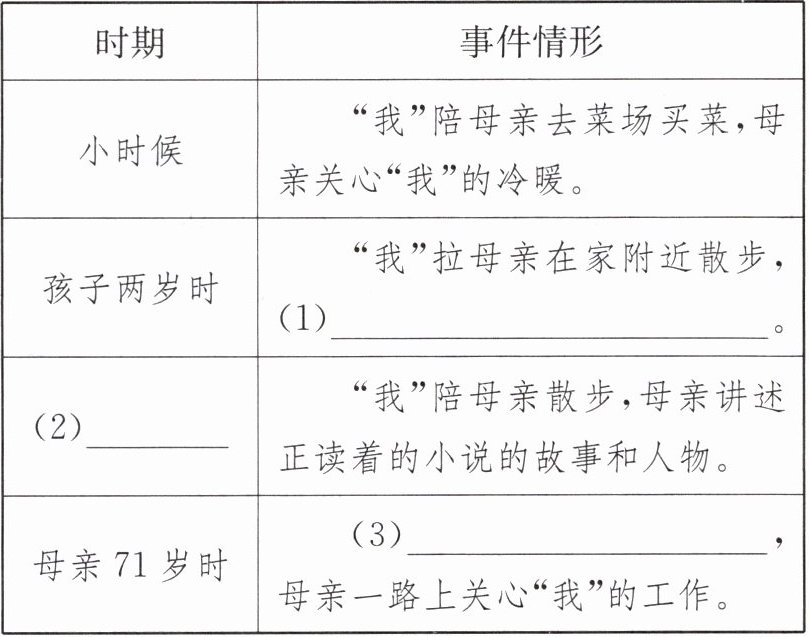 | 孩子两岁时 | “我”拉母亲在家附近散步,(1)______。 |