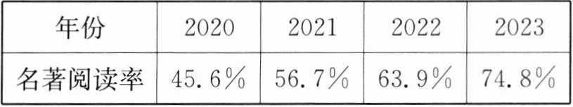 [解析]根据表格中2020—2023年名著阅读率的数据变化"45.6%""56.7%""63.9%""74.8%"可知,该地初中生名著阅读率在逐年提高。